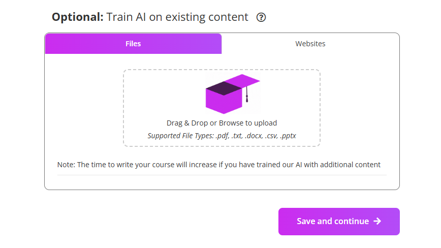 Coursebox admite todos los tipos de archivos principales, incluidos DOCX, PDF, TXT, PPTX, CSV y archivos de vídeo, así como enlaces directos a sitios web. La plataforma extrae automáticamente el texto y los conceptos clave de cada fuente para generar tarjetas didácticas precisas.