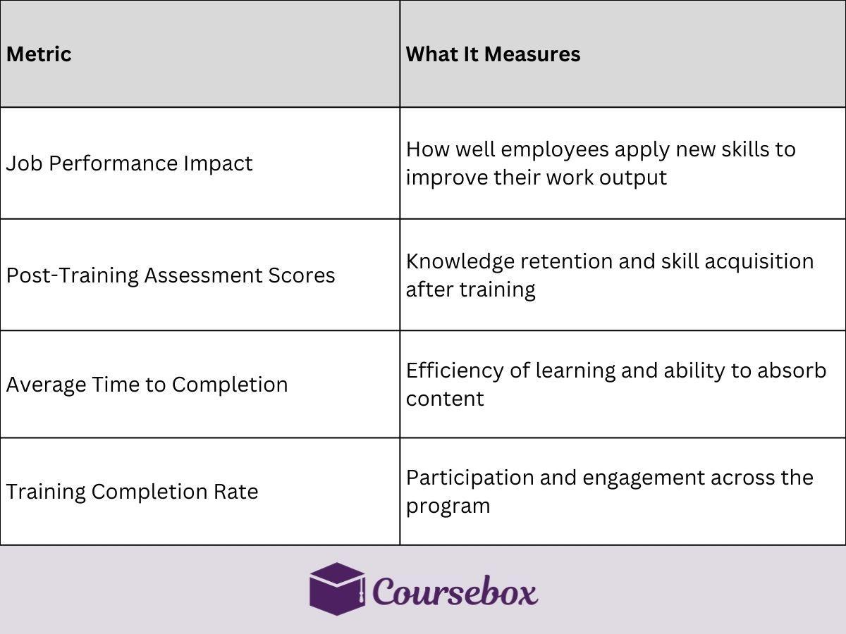 이러한 KPI는 직원들이 얼마나 잘 배우고, 새로운 기술을 적용하고, 성과를 개선하고 있는지를 측정하는 지표입니다.이를 추적하면 효과가 있는 부분과 그렇지 않은 부분, 교육을 조정해야 하는 부분을 파악하는 데 도움이 됩니다.추적해야 하는 KPI에는 다음이 포함됩니다.