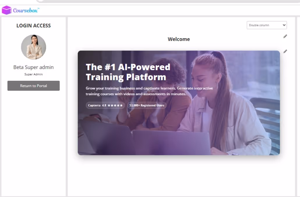 Torne sua plataforma verdadeiramente sua. Hospede seu LMS em seu domínio personalizado, completo com as cores, o logotipo e a identidade da sua marca, não os nossos. Cada interação do aluno, do login à certificação, carrega apenas o nome da sua marca. Com a configuração de etiqueta branca do Coursebox, sua plataforma parece ter sido construída inteiramente internamente.